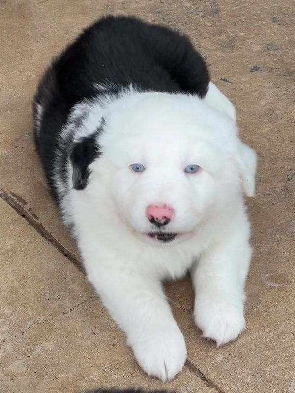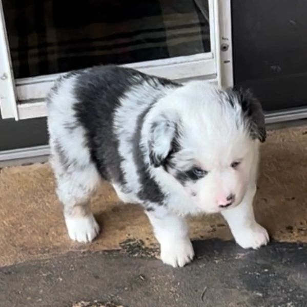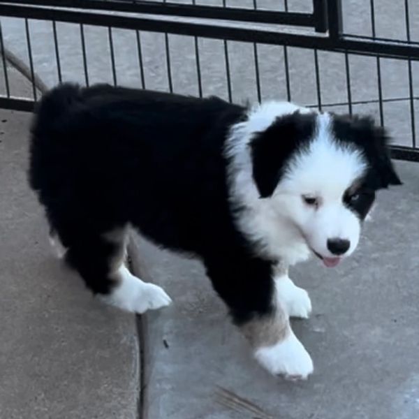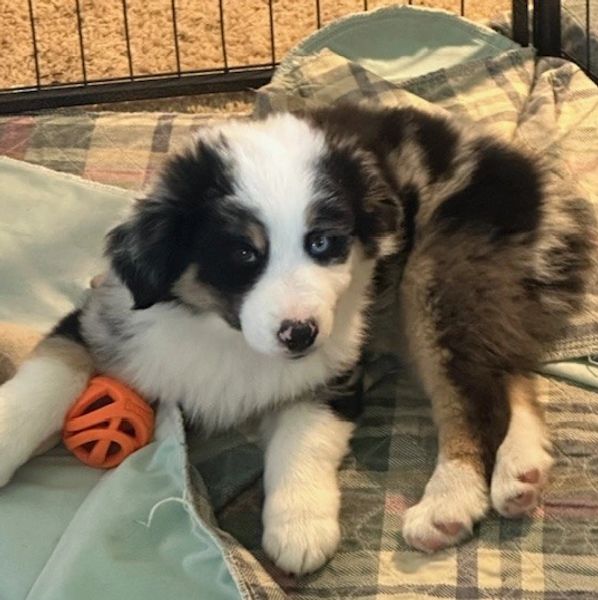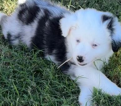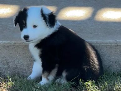 "MIDGE" is looking for her forever home. She is perfectly marked with full collar and blaze PLUS 2 BLUE EYES. All of our puppies are raised in our home with love and care. They are exposed to different sounds and experiences to help them develop into confident and well-socialized puppies. We provide age appropriate vaccinations and deworming.